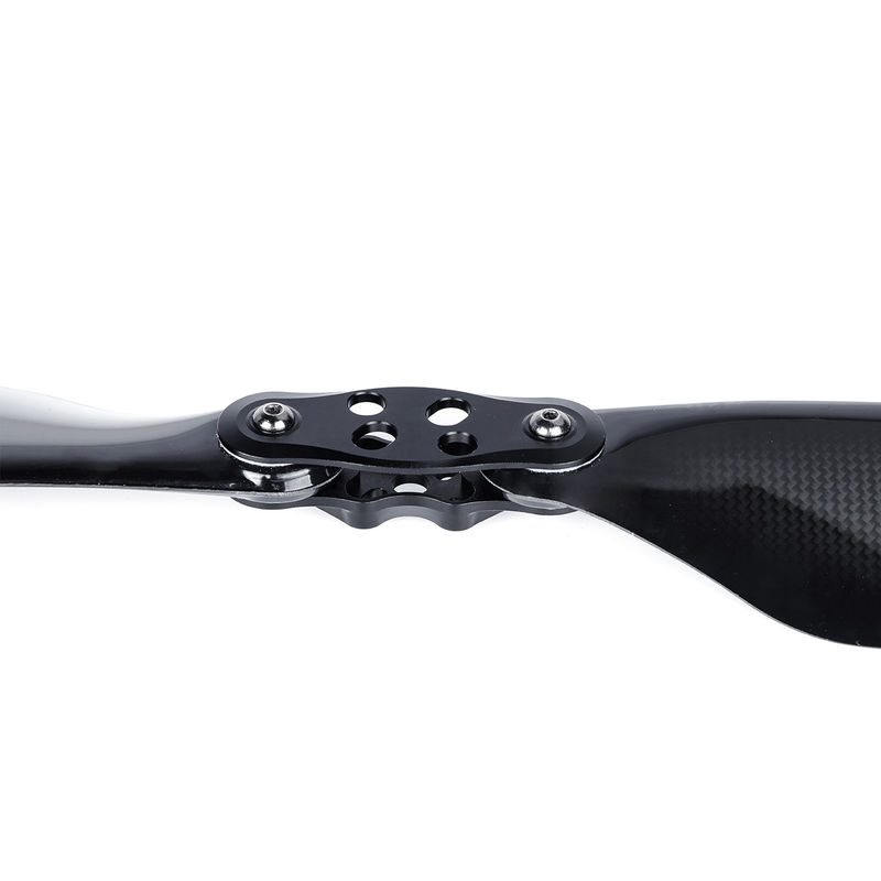Solid under high loads High efficiency, longer flight time for drones. Special wingtip design helping to reduce vortices. Low noise at the same thrust level comparing with other folding drone carbon propeller. Optimized airfoil design, low interference by airflow. Well dynamic balanced. Propeller Lock Mechanism, designed and proved to ensure safety flight.